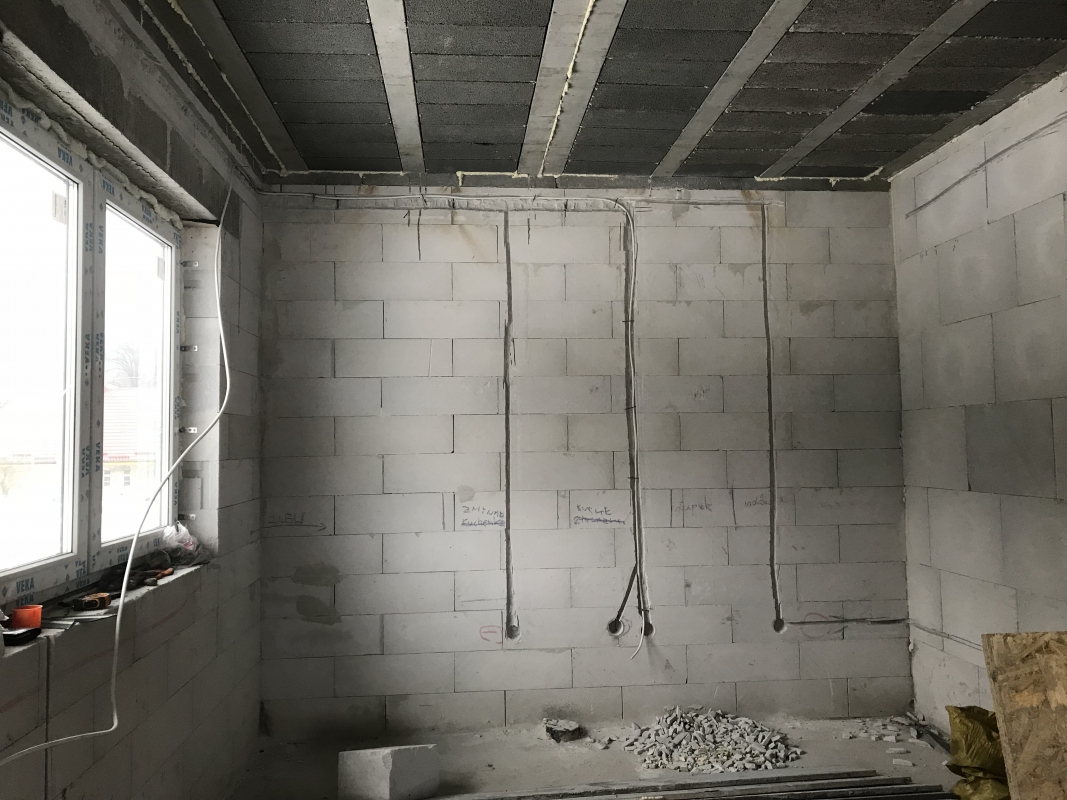 Żeby zaoszczędzić kasę postanowilismy, ze kable położymy sami. W czwartek i piątek zrobiliśmy wszystkie bruzdy, a w niedziele położyliśmy wszystkie kable do gniazdek😀Dzisiaj po pracy jedziemy je dokładnie poukładać i zagipsować. Na wtorek przewidujemy położyć kable do oświetlenia.